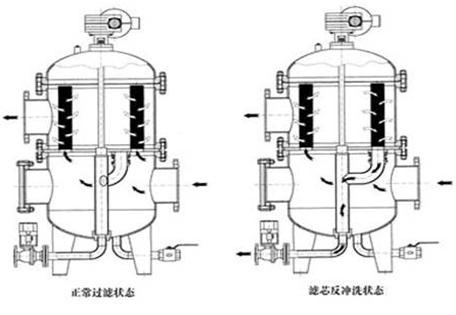 RZFG型全自動濾水器由執(zhí)行機(jī)構(gòu)及自動控制機(jī)構(gòu)組成,執(zhí)行機(jī)構(gòu)由電動減速裝置、濾水器本體、電動排污閥等組成。自動控制機(jī)構(gòu)由安裝在濾水器本體上的差壓控制器及PLC、模塊、電器控制箱組成。